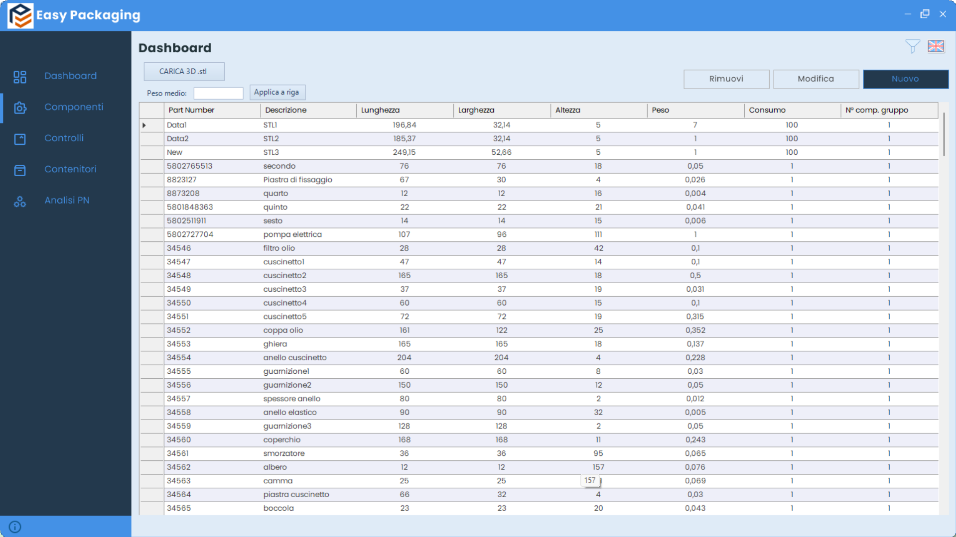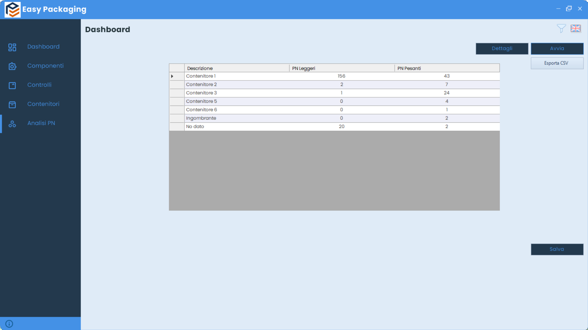 In questa pagina si ha la visione del numero di componenti analizzati, divisi tra leggeri e pesanti. Inoltre si ha la visione dell’ultima analisi eseguita e di quella corrente, per ognuna delle due analisi presenti sono mostrati i risultati finali: Numero di contenitori per ogni tipologia necessari a soddisfare la richiesta di packaging per i componenti in analisi.
