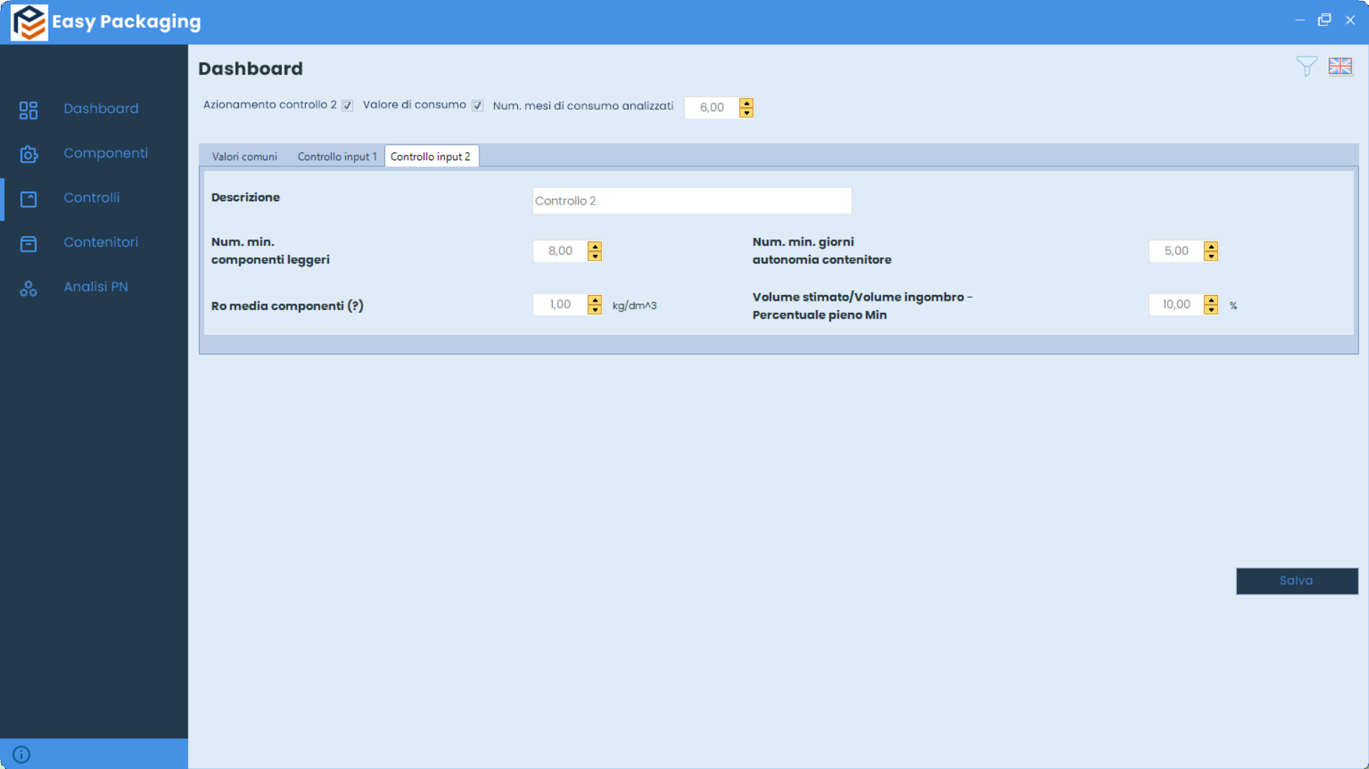 In questa pagina dobbiamo inserire i valori che caratterizzano il packaging desiderato in termini di: Numero minimo componenti nel contenitore, Limite peso per componenti leggeri, Peso netto trasportabile a mano, Numero minimo di giorni autonomia contenitore, Densità media componenti, Percentuale pieno minima. Questi valori di controllo sono raggruppati in 3 diversi gruppi: