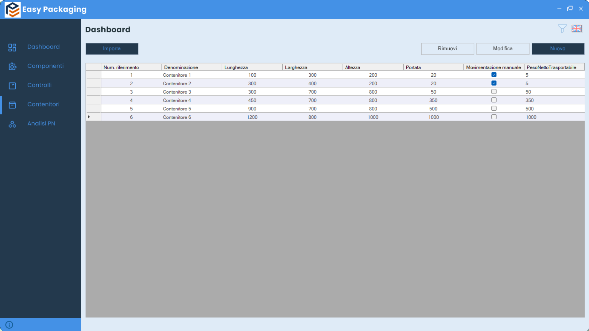 - Nuovo: per aggiungere i nuovi contenitori singolarmente