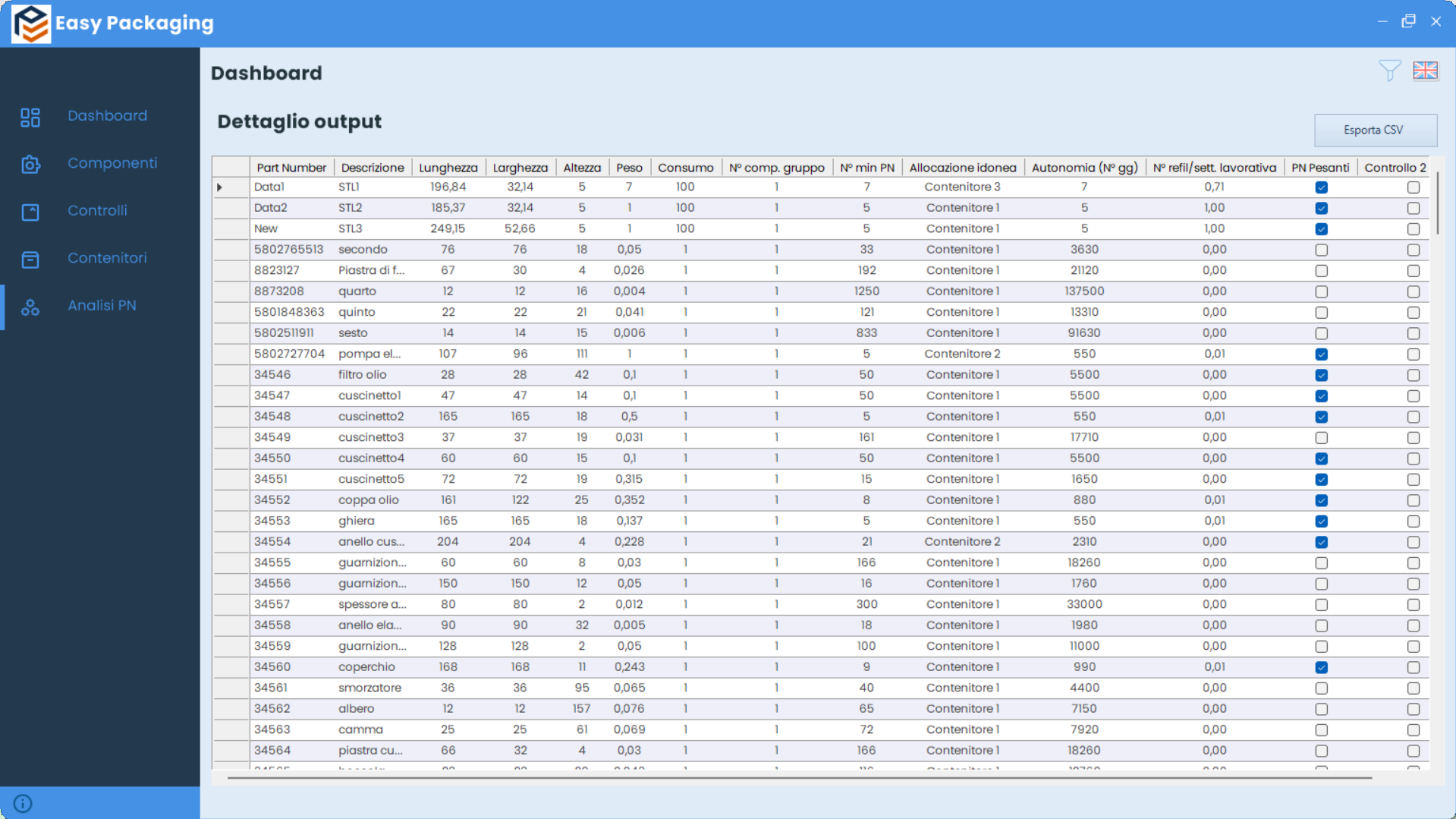 In questa pagina possiamo vedere il dettaglio del packaging ottimale risultante che il software ha associato ad ogni componente in analisi, in termini di: tipologia packaging scelto, dimensioni packaging scelto, numero minimo di componenti allocabili nel contenitore, autonomia del contenitore pieno in numero di giorni lavorativi, numero di refil necessari ad ogni settimana lavorativa, indicazione se il componente è considerato pesante, indicazione se per il componente si è attivato il Controllo 2.